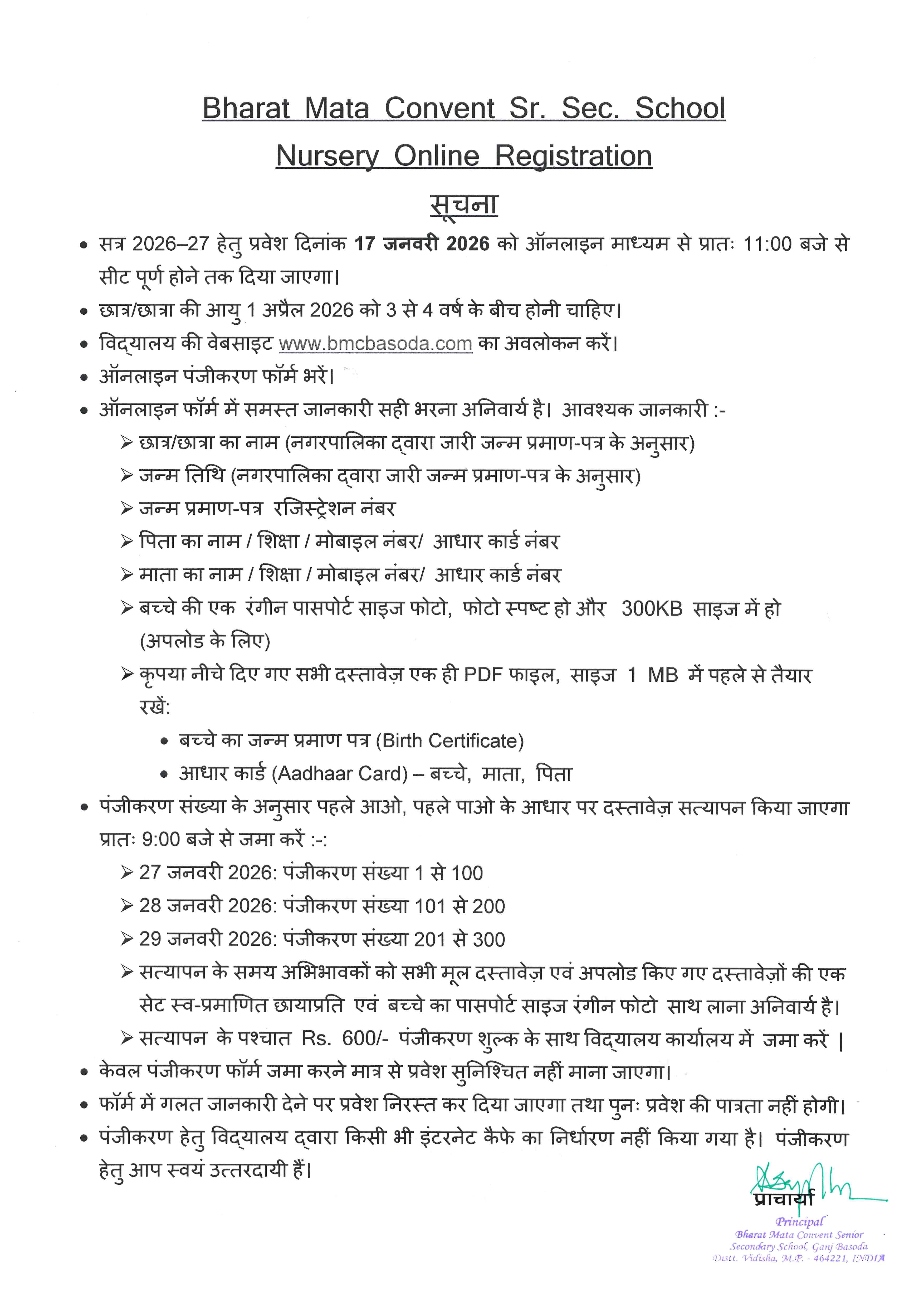 Online registration for Nursery Admission, Session 26/27 on 17th January 2026 at 11:00 AM.